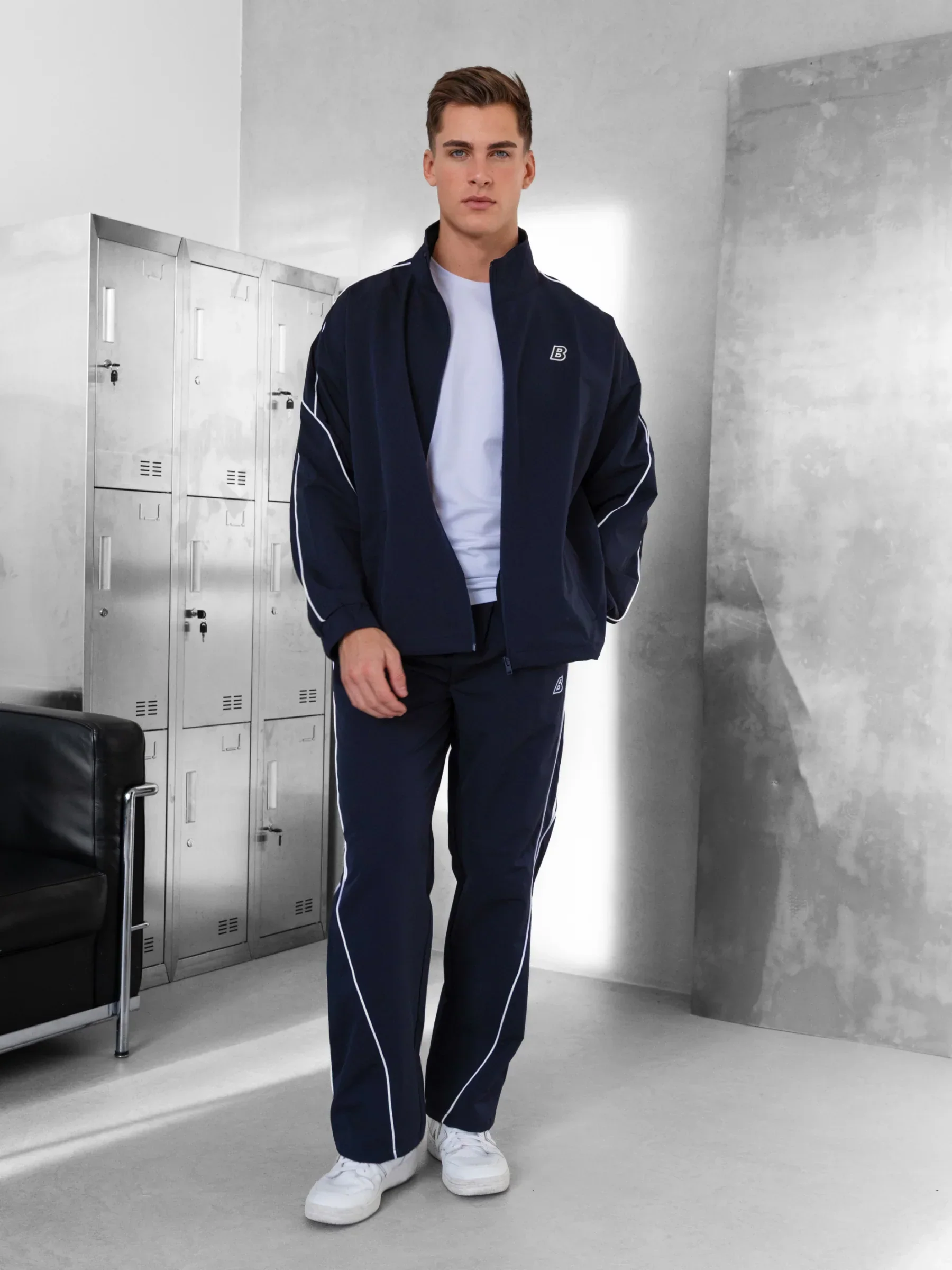 Our Blakely Track Jacket in True Navy is crafted with a slouchy relaxed fit, and a full zip design. The jacket features side pockets, a piping design down the side and an embroidered B on the left side of the chest. Pair with the matching Track bottom for a full look.